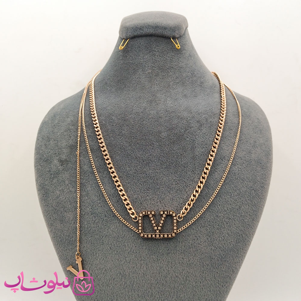 گردنبند زنانه چند ردیفه استیل رز گلد حرف V کد 2561