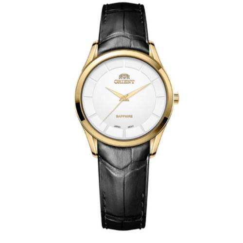 ساعت مچی زنانه اورینت مدل 1063 بند مشکی صفحه سفید قاب طلایی